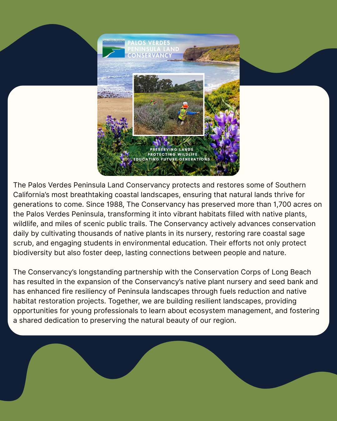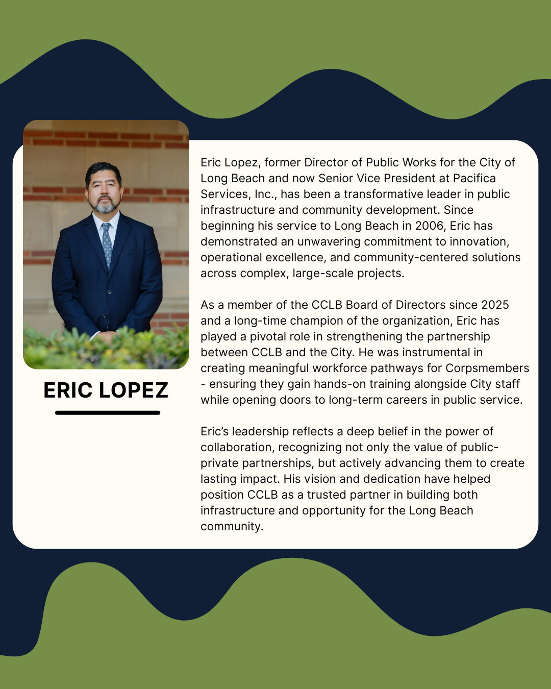 The Conservation Corps of Long Beach is proud to recognize outstanding individuals and organizations dedicated to championing the Corps movement, environmental stewardship, and service to the community. These 2026 honorees have demonstrated exceptional commitment to sustainability and have made significant contributions to our mission. This year's recipients have positively impacted our local environment and the lives of our Corpsmembers, and their hard work and passion for conservation serve as an inspiration for others. Join us in celebrating these outstanding people and their accomplishments. Together, we continue to build a healthier, more sustainable community.